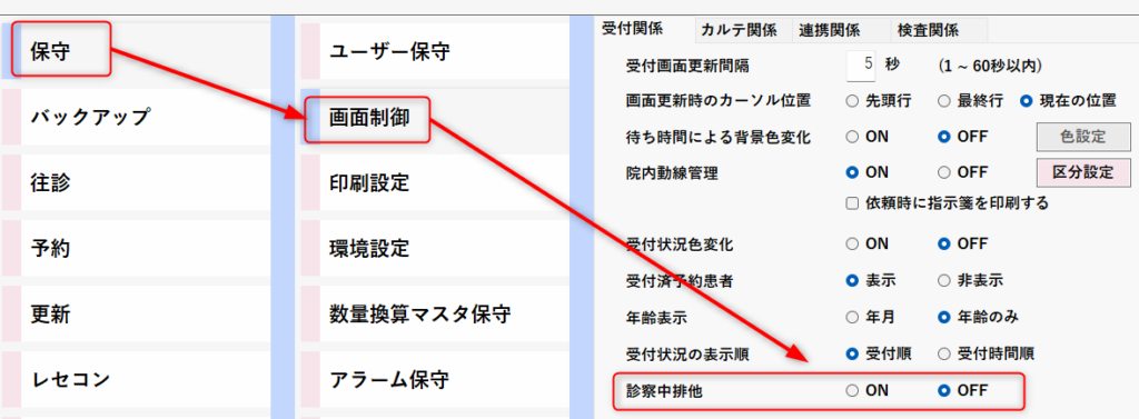 本機能をOFF(無効)にすると、カルテと患者登録、患者病名、診療行為の画面が同時に開けるようになります。