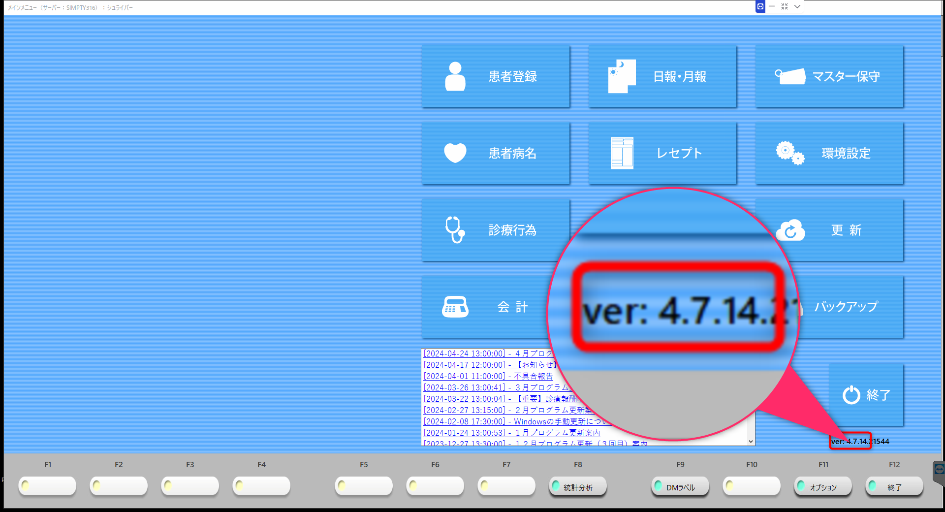 メインメニュー右下、終了ボタンの近くに表示されている数字がバージョンになります。