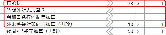 診療行為入力時、時間区分を「夜間」などに設定している状態で再診料を入力すると、再診料と加算が別括りに