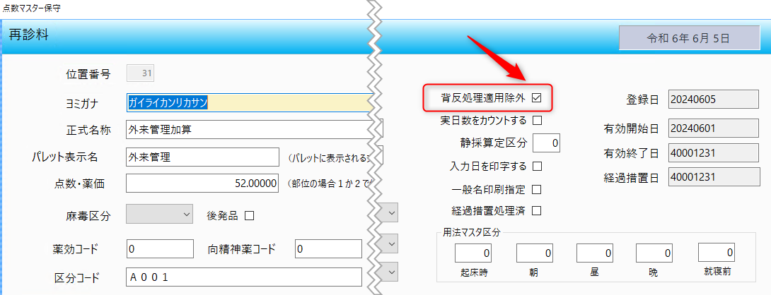 ⑥ 外来管理加算の設定画面が表示されましたら、右上の方にある[背反処理適用除外]のチェックボックスをクリックしてチェックを入れます。