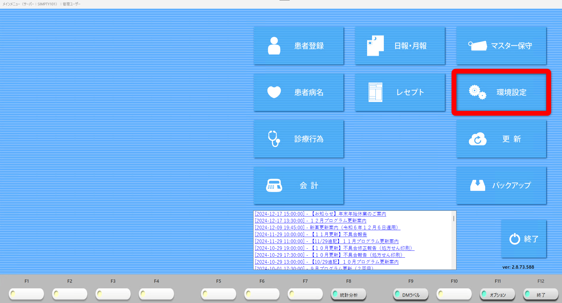 1.レセコンのメインメニューから「環境設定」をクリックします。