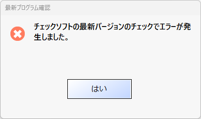 現在、チェックソフトの更新サーバに不具合が発生しており、最新バージョンのチェックがエラーになります。下記のメッセージが表示されたときは「はい」をクリックしてください。