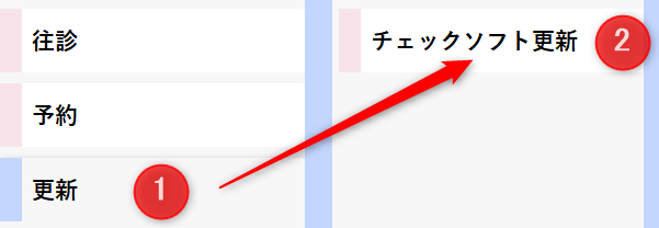 2 [ 更新 ] → [ チェックソフト更新 ] の順番にクリックします。