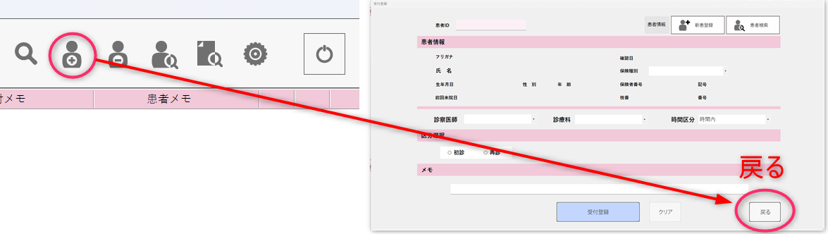 <手動更新方法> ①患者受付をクリック ②「戻る」をクリック
