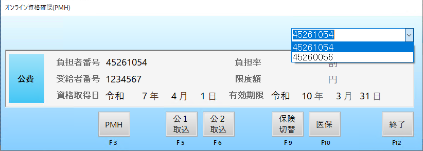 取得したファイルに公費番号が複数ある場合は、オンライン資格確認(PMH)画面に